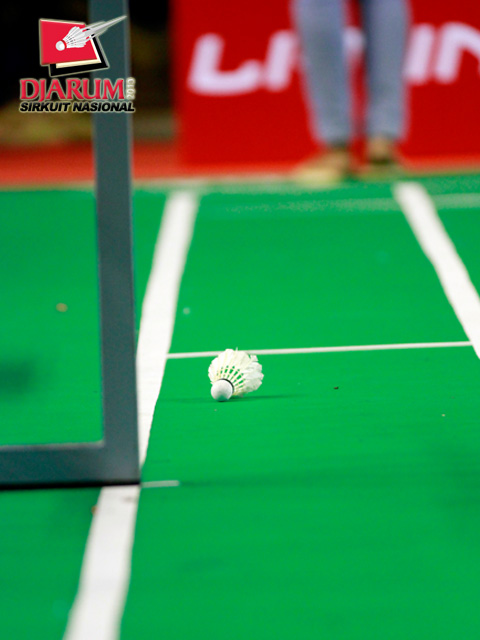 Dua pekerja sedang meletakkan peralatan perlengkapan Djarum Sirkuit Nasional Li-Ning Lampung Open 2013.