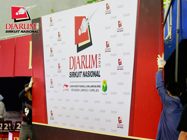 Seorang pekerja bersiap mengangkat backdrop Djarum Sirkuit Nasional Li-Ning Lampung Open 2013.
