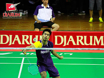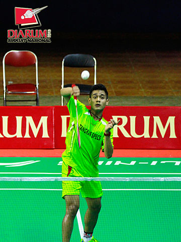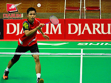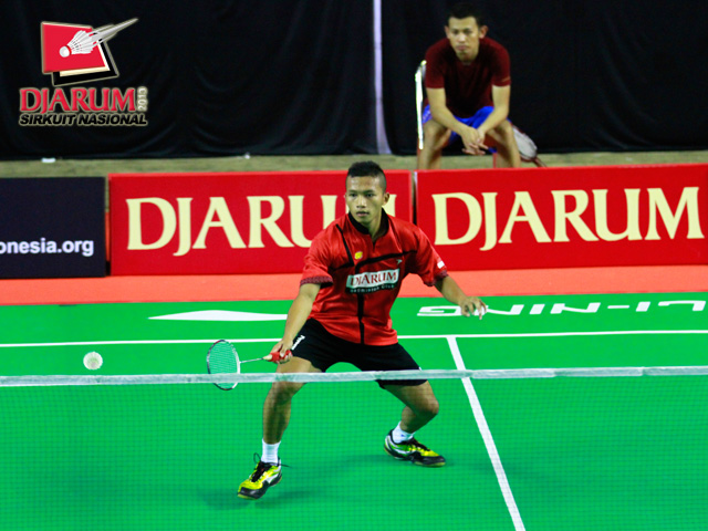 Kho Hendrikho (PB Djarum) mengembalikan kok ke arah Julkifli (Satria Diva).