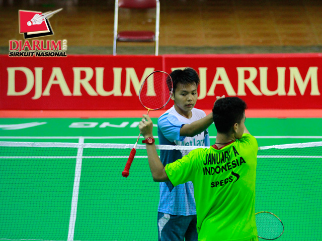 Ari Januari (Tangkas Specs) mengembalikan kok ke arah Stevanus Galih (Jaya Raya Metland).