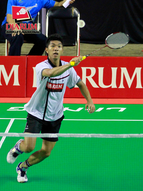Ryan Fajar (PB Djarum) menyambar pengembalian tanggung dari Pandu Dewantoro (Sarwendah).