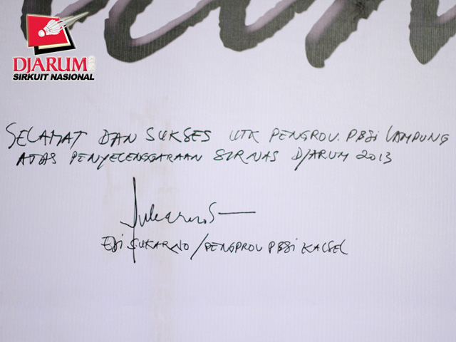 Salah seorang pengurus provinsi PBSI Lampung menuliskan ucapan selamat atas terselenggaranya Djarum Sirkuit Nasional Li-Ning 2013 di papan testimoni yang disediakan panitia pelaksana.