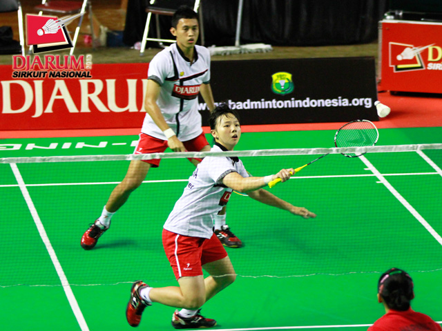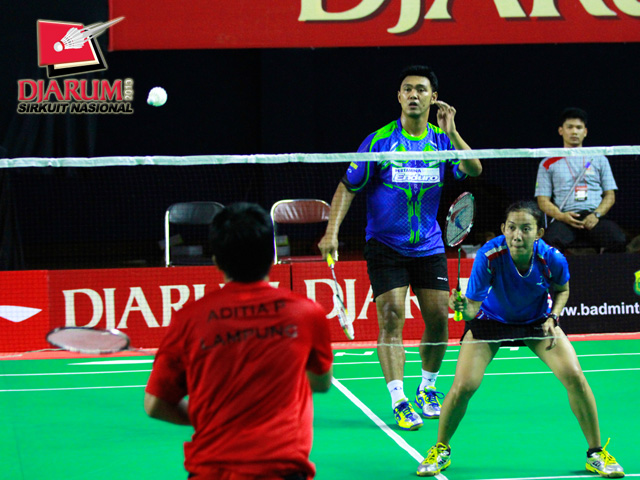 Rian Swastedian/Masita Mahmudin (Pusdiklat Jaya raya) mengembalikan kok ke arah Sabar Karyaman/Shinta Dwi (Exist).