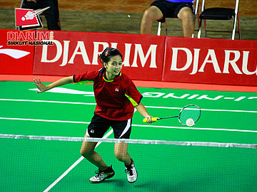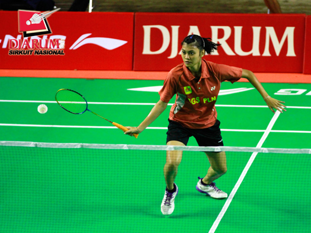 Marsa Indah (PB Djarum) mengembalikan kok ke arah Gladys Virginia (Jaya Raya Suryanaga).