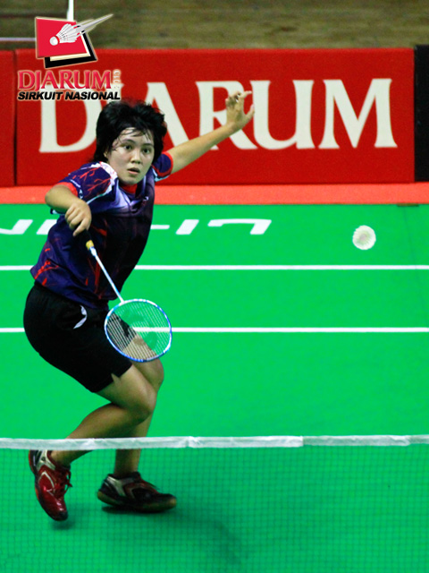 Aida Arum (PB Djarum) menahan serangan yang dilancarkan Mitzi Abigail (Sarwendah).