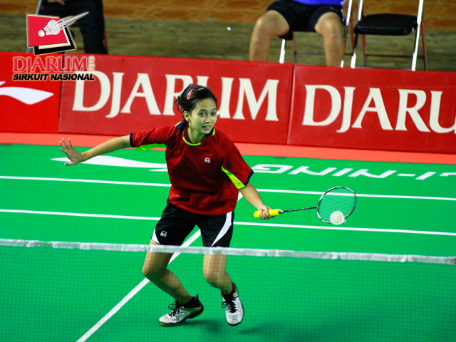 Rena Asela (PB Djarum) mengembalikan kok ke arah Nadya Puteri (Mutiara Bandung).