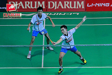 Andika Ramadiansyah/M. Febriansyah (PB Djarum) menyambar pengembalian dari Adittya Dwiantoro/Kevin Ezra (Exist).