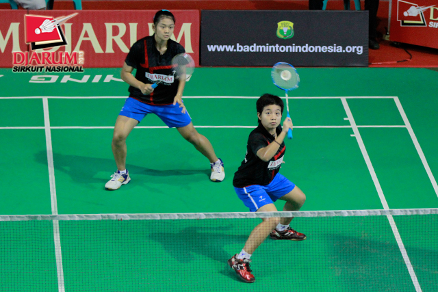 Felicia Parmenas/Marsheilla Gischa (PB Djarum) bersiap menghadang serangan yang dilepaskan pasangan ganda remaja putri Mutiara Bandung, Nisak Puji/Rika Rositawati.