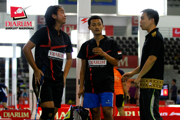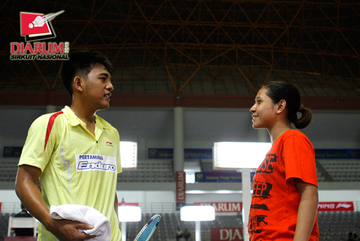 . Pebulutangkis tunggal dewasa putra Pertamina Indonesia, Indra Setiawan (kiri) saat menerima masukan dari Ganis Nurrahmandani.