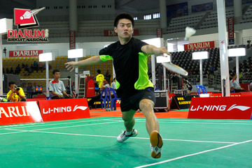 Qin Zheng (China) bersiap mengembalikan shuttlecock ke arah Rudi Cahyadi (PB Djarum).