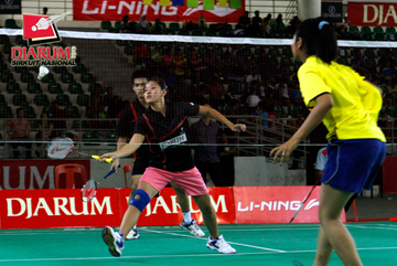 Tedi Supriadi/Ravenska Cintya (PB Djarum) bersiap menyambut pengembalian dari Felix Eka/Natasha Herloardjo (Exist).