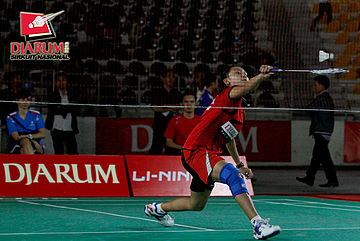 Taufik Hidayat (Indocafe Medan) berusaha mengembalikan shuttlecock ke arah Handoko (PB Alwaslyah).