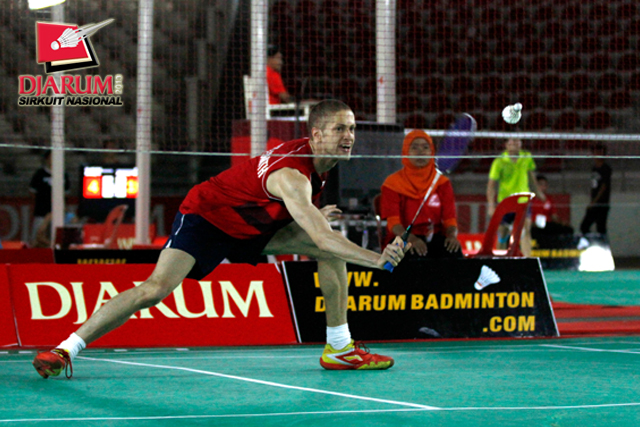 Michael Peter (Inggris) berhasil menahan serangan yang dilepaskan Rizky Antasari (Hi Qua Wima).