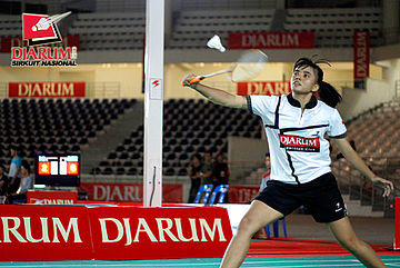 Darmiko/Deariska Putri (PB Djarum) mengembalikan shuttlecock ke arah Syarief Syahmie/Ery Octaviani (JR Enkei/Jaya Raya).
