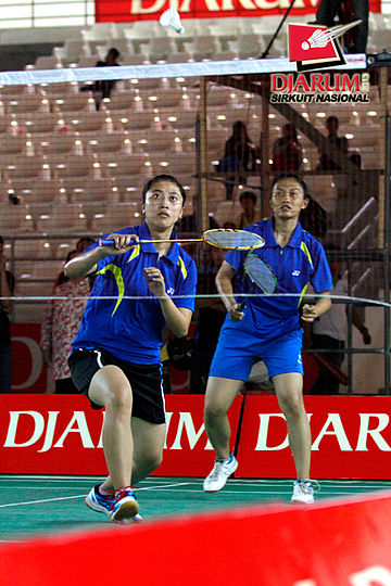 Nisak Puji Lestari/Rika Rositawati (Mutiara Bandung) menyambut pengembalian dari Cynthia Shara/Ramadhani Hastiyanti (PB Djarum).
