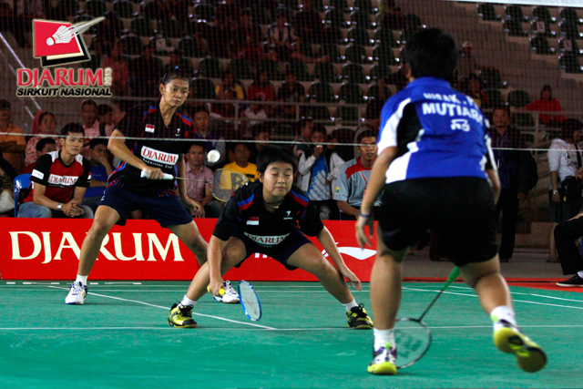 Cynthia Shara/Ramadhani Hastiyanti (PB Djarum) bersiap menghadang serangan yang dilepaskan Nisak Puji Lestari/Rika Rositawati (Mutiara Bandung).