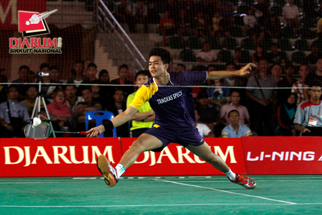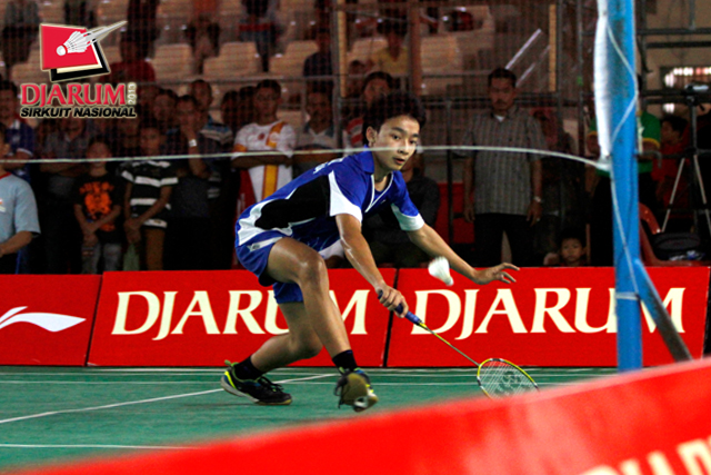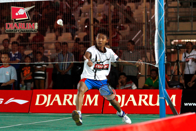 M. Rehan Diaz (Mutiara Bandung) berhasil membaca pengembalian dari Bagas Kristianto (PB Djarum).