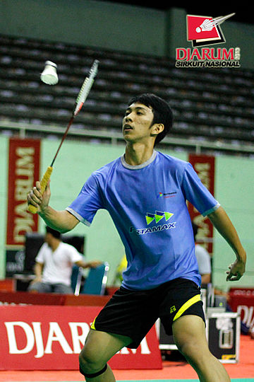 Alang Panji (Pertamina Indonesia) mengembalikan shuttlecock ke arah Syaherdillah Wijianto (Pendowo).