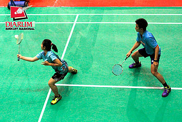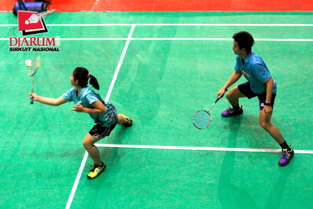 Bagus Haryanto/Nuansa Giva (Mutiara Bandung) mengembalikan shuttlecock ke arah Darmiko/Deariska Putri (PB Djarum).
