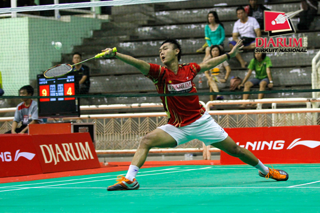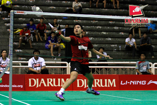 Kho Hendriko (PB Djarum) mengembalikan shuttlecock ke arah Alamsyah Yunus (Pertamina Indonesia).