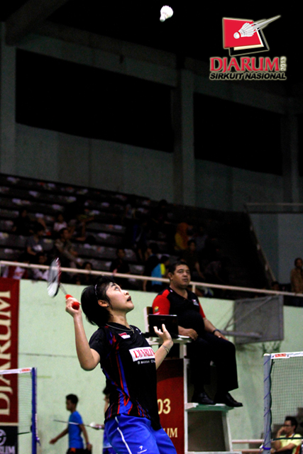 Febby Angguni (PB Djarum) menyambar pengembalian dari Jessica Muljati (Ananda).