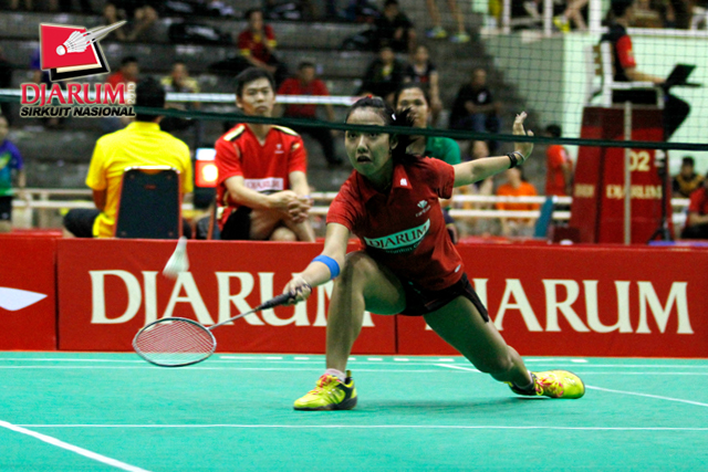Dinar Dyah Ayustine (PB Djarum) mengembalikan shuttlecock ke arah Tike Arieda (Jaya Raya Suryanaga).