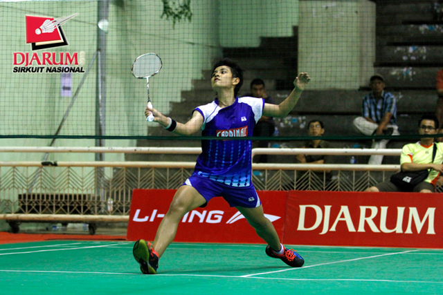 Rudi Cahyadi (PB Djarum) mengembalikan shuttlecock ke arah Evert Sukamta (Tangkas Specs).