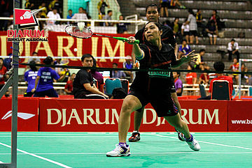 Abu Bakar/Tedi Supriadi (PB Djarum) bersiap menyambut pengembalian dari Achmad Fasich/Regawa Tamasuta (Citra Raya Unesa/Semen Gresik).