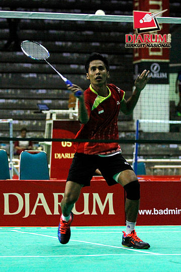 Alamsyah Yunus (Pertamina Indonesia) bersiap menyambar pengembalian dari Panji Akbar (Pelatnas).