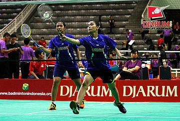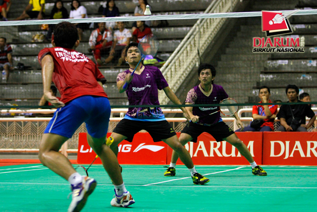 Jeka Wiratama/Vicky Rizky (PB Djarum) berhasil menghadang serangan yang dilepaskan Rizko Azuro/Wildan Atmaja (Guna Dharma).
