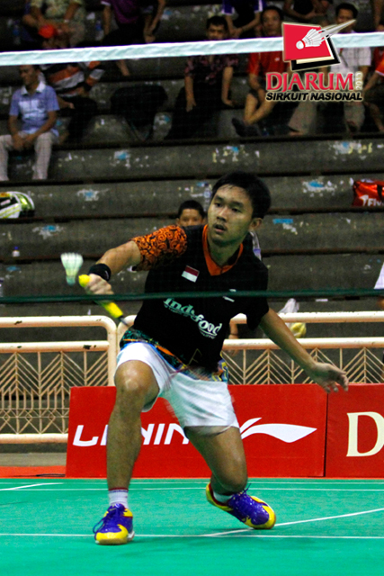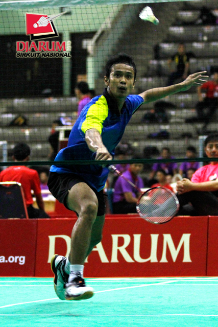 Setyaldi Putra (Pelatnas) bersiap mengembalikan shuttlecock ke arah Senatria Agus (SGS PLN).