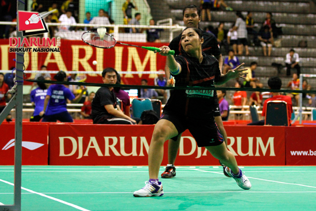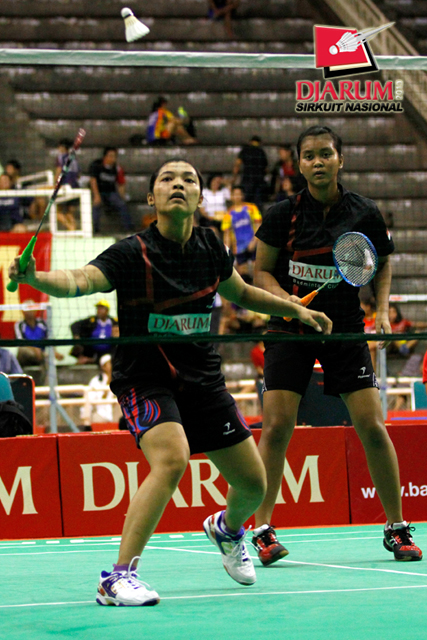 Chintia Rhizta/Ristya Ayu (PB Djarum) mengembalikan shuttlecock ke arah Annisa Purnama Sari/Ihsaniaty Putri (Gua Dharma).