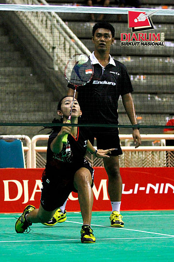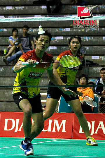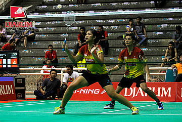 Ardiansyah Putra/Devi Tika Permatasari (Pertamina Indonesia/SGS PLN) menyambar pengembalian tanggung dari Didit Juang/Nurbeta Kwanrico (PB Djarum).
