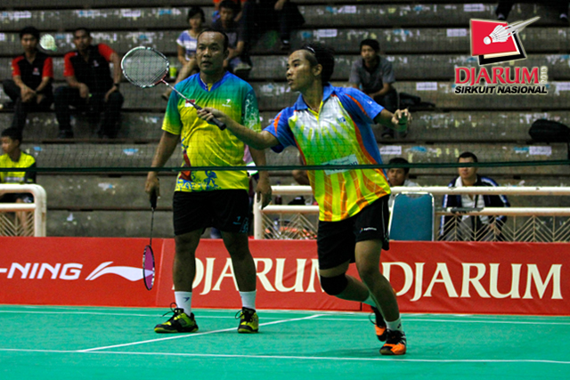 Ardiansyah Putra/Devi Tika Permatasari (Pertamina Indonesia/SGS PLN) mengembalikan shuttlecock ke arah Didit Juang/Nurbeta Kwanrico (PB Djarum).