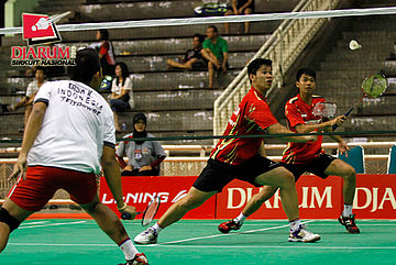 Rendra Wijaya/Rian Sukmawan (Musica Champion) menyambar pengembalian dari Rahmat Adianto/Seiko Wahyu (PB Djarum).