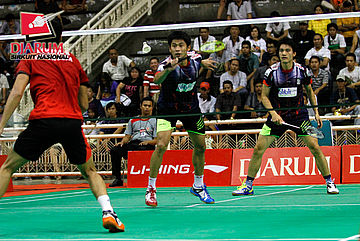 Rahmat Adianto/Seiko Wahyu (PB Djarum) mengembalikan shuttlecock ke arah Rendra Wijaya/Rian Sukmawan (Musica Champion).