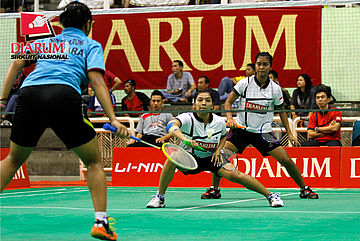Kenas Adi/Rangga Yave (PB Djarum) berusaha menghadang pengembalian dari Riyo Arif/Rizky Hidayat (Hi Qua Wima).