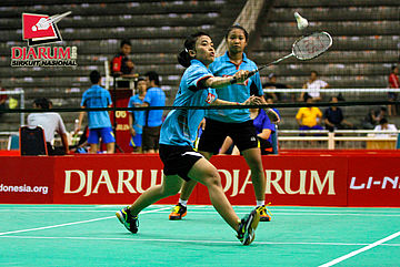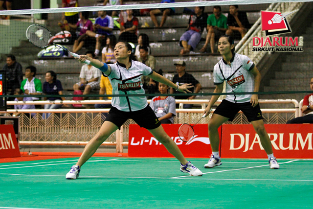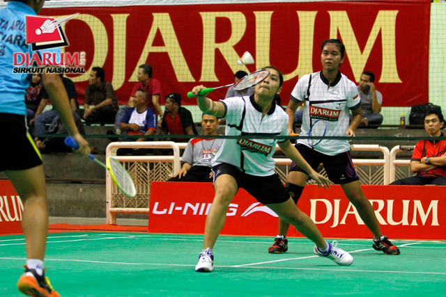 Chintia Rhizta/Ristya Ayu (PB Djarum) mengembalikan shuttlecock ke arah Linda Mutiara/Sinta Arum (Mutiara Bandung).