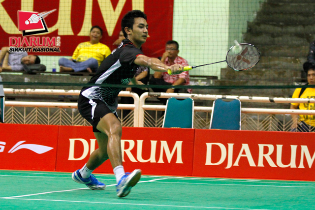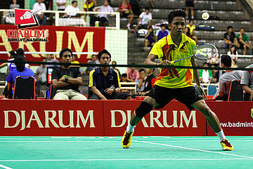 Thomi Azizan (Pelatnas) mengembalikan shuttlecock ke arah Setyaldi Putra (Pelatnas).
