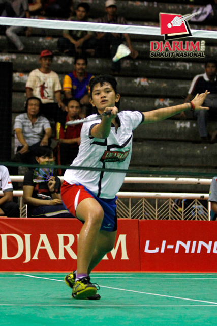Gregoria Mariska (Mutiara Bandung) bersiap mengembalikan shuttlecock ke arah Ghaida Nurul (PB Djarum).