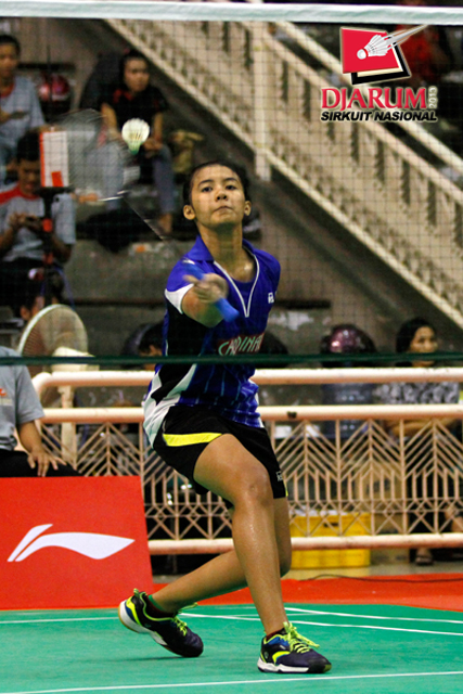 Febby Angguni (PB Djarum) berhasil menghadang serangan yang dilepaskan Maziyyah Nadhir (Pelatas).