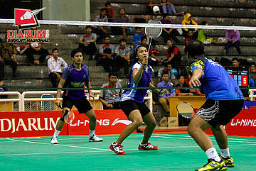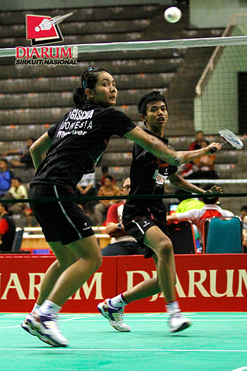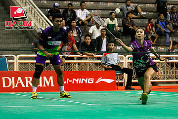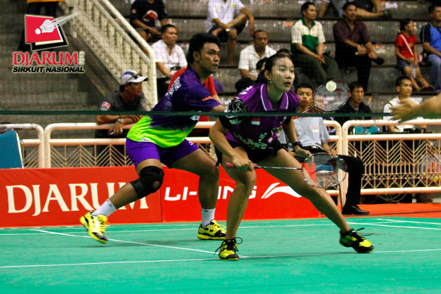 Achmad Rivai/Aris Budiharti (Bank Sumsel/Jaya Raya) mengembalikan shuttlecock ke arah Trikus Haryanto/Nadya Melati (Pertamina Indonesia).