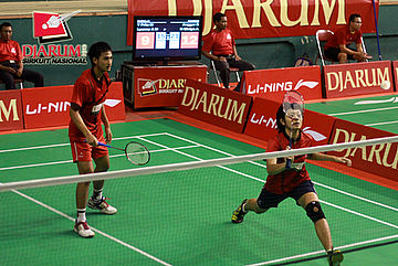 Brenda Wahyu (SURYABAJA) mengembalikan shuttlecock ke arah Nur Hadi Effun (JAYA RAYA SURYANAGA).