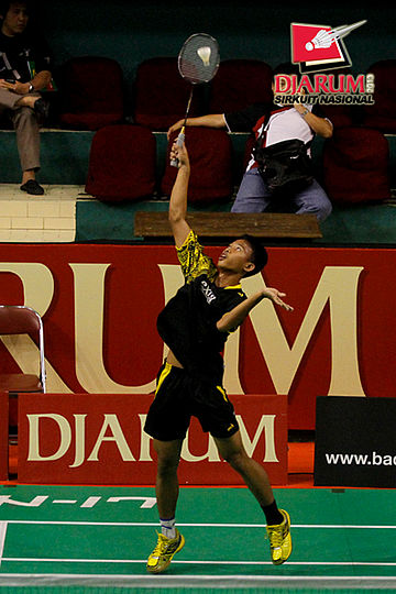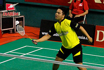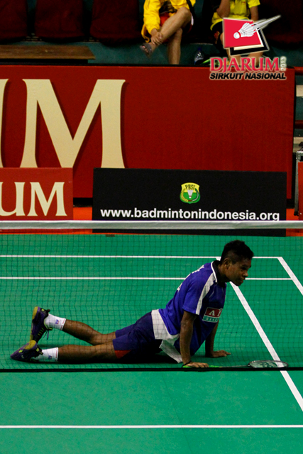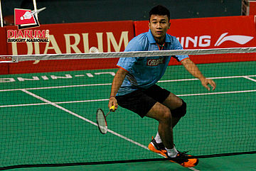 Linggo Hariyanto (HIQUA WIMA) mencoba menggapai shuttlecock.
