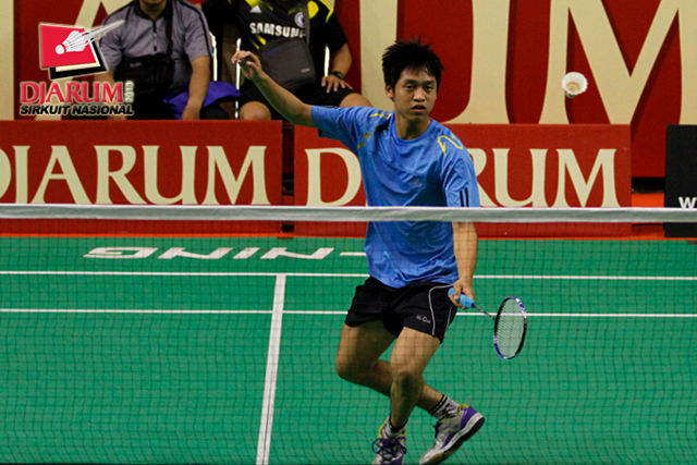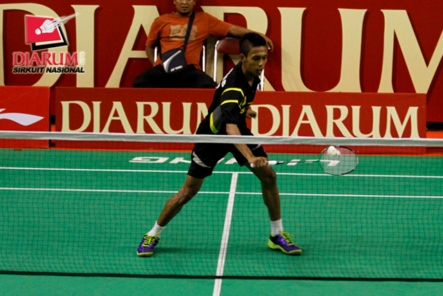 I Putu Roy Danu Wd (SEMEN GRESIK) mengembalikan shuttlecock ke arah Kurniawan Wijanarko (TAHFIDZQU).