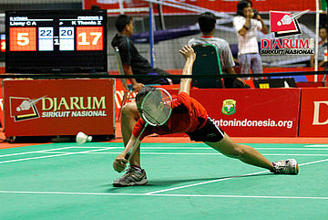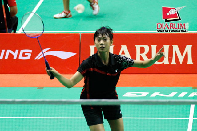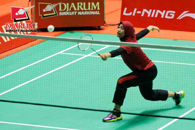 Khristin Thonia (Pendowo) gagal mengembalikan shuttlecock ke arah Liony Citra (Bintang Utama).