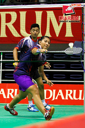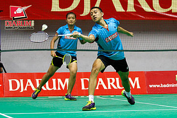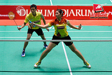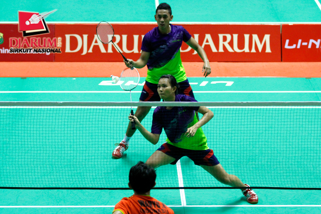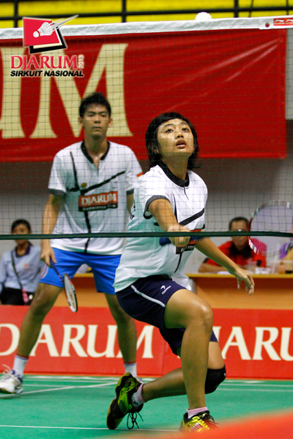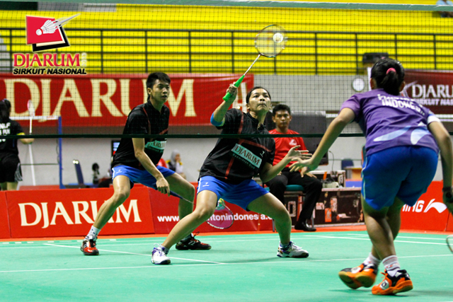 Darmiko/Deariska Putri (PB Djarum) berhasil menghadang serangan yang dilepaskan pasangan Dwi Setiawan/Endang Nursugianti (Tsunami/Tangkas Specs).