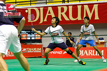 Aldo Abdillah/Desaula Gendy (Jaya Raya) berusaha menggapai pengembalian dari Wisnu Wardhana/Aprodhita Jenuary (PBSI Kota Yogyakarta).