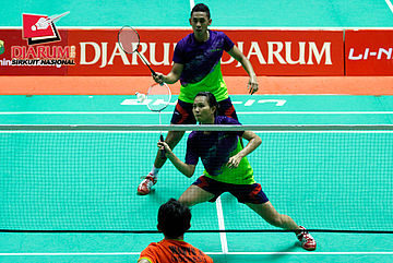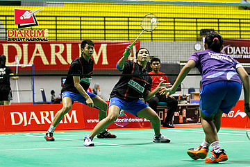 M. Tegar/Zakia Ulfa (Aufa) bersiap menyambar pengembalian tanggung dari Wahyu Hariyansyah/Novi Darmayanti (Candra Wijaya).