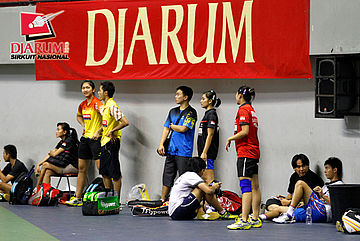 Beberapa atlet PB Djarum bersiap-siap di pinggir lapangan sebelum bertanding.